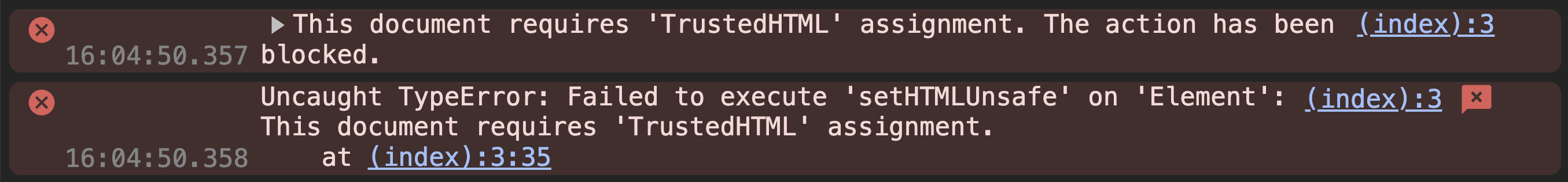 If the above response header is set, whenever a string is passed to an unsafe sink it will cause a TypeError e.g.: