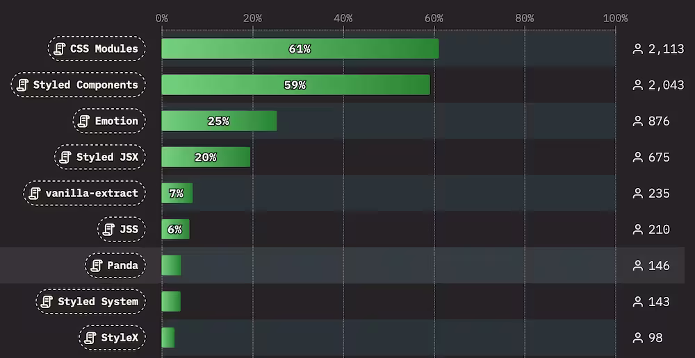 According to the State of CSS 2024 survey, styled-components remains the most popular CSS-in-JS solution.