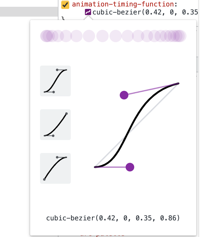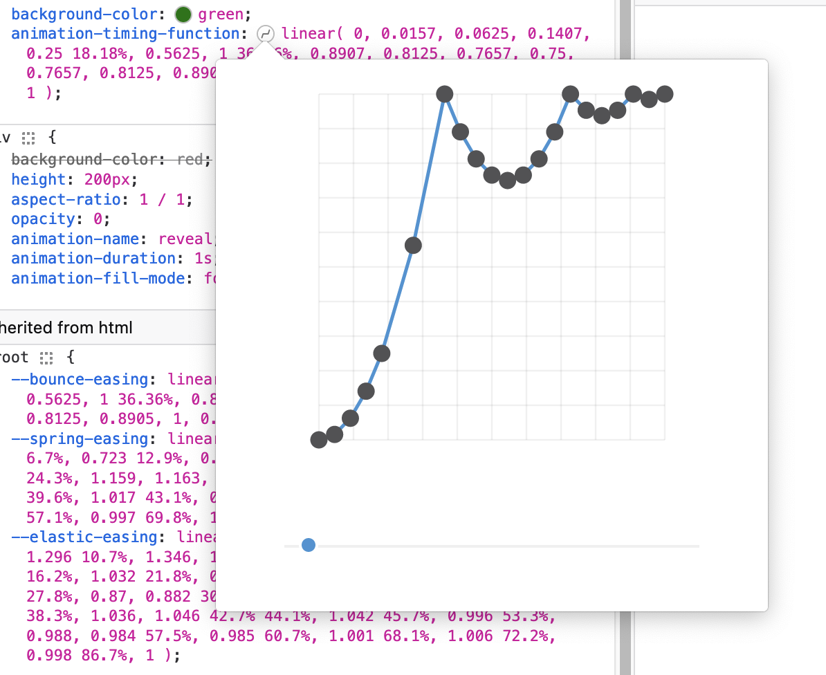 If you do want to finesse an easing by hand, Firefox devtools is helpful. Double-click anywhere on the curve to add a point. Double-click a point to remove it. Be aware that if you’re using a CSS variable to specify the value, the Firefox easing editor won’t be available.