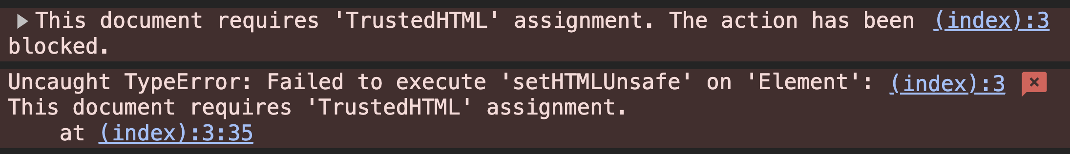 If the above response header is set, whenever a string is passed to an unsafe sink it will cause a TypeError e.g.: